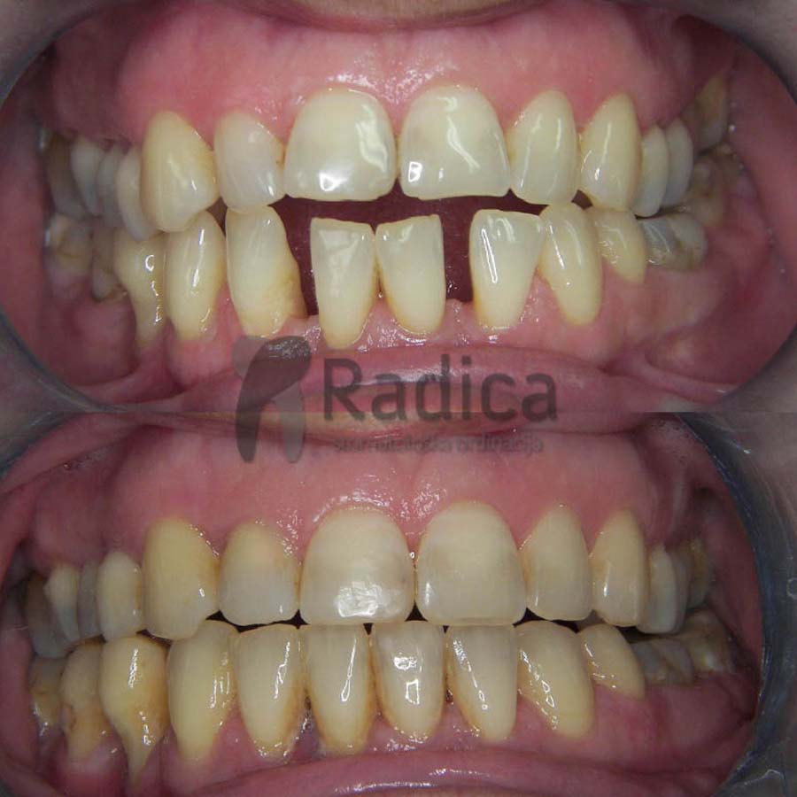 Dakle, poslagat ćemo zube koje imamo, osigurati okluziju, stvoriti prostor za nadoknadu nekih zuba i samim tim spriječiti daljnje propadanje zuba i zagriza ali rezultat će biti „realan“ i daleko od onog idealnog rezultata kojeg možemo postići kod mladih osoba koje imaju sve zube.