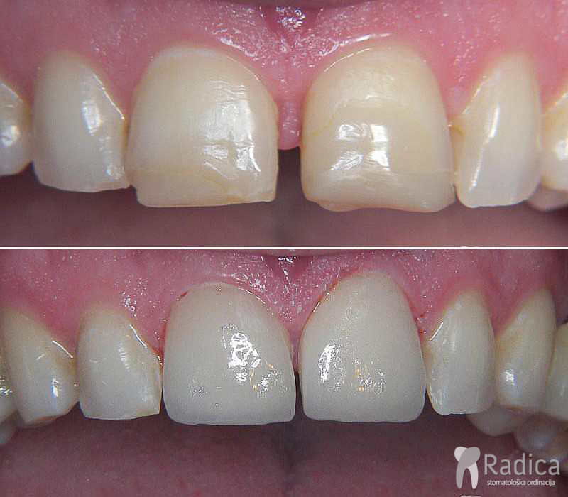 Nadalje, zubi se mogu poljepšati pomoću krunica i ljuskica ili veneera. Ako je zub čitav ili postoje mali ispuni, najbolji izbor su ljuskice. Njih možemo slikovito opisati kao „umjetni nokat“ – dakle, zub se ispreparira za oko 1,5-2,5 mm s prednje i bočnih strana, uzme se otisak pa tehničar u laboratoriju napravi ljuskice od keramike kojima se popravljaju oblik i boja zuba pa se te ljuskice lijepe na zube. Tako se mogu ispraviti i manji nedostaci u položaju zuba.