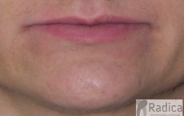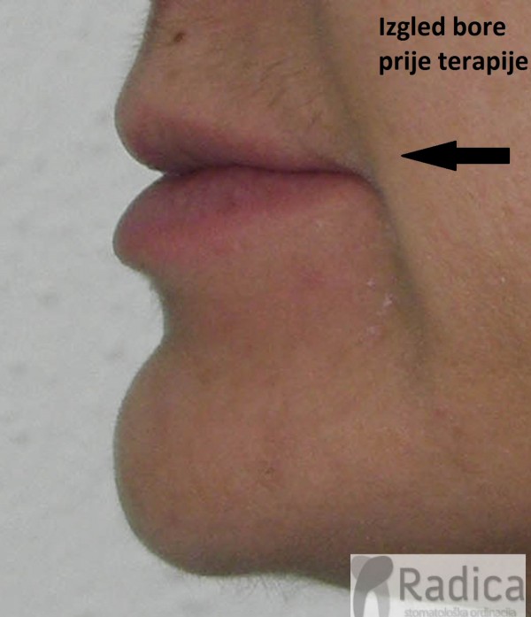 Također, zbog produbljena zagriza kutovi usana padaju, nazolabijalne bore se produbljuju i izdužuju i lice dobiva starački izgled što možete vidjeti na slijedećim slikama. Nakon podizanja zagriza fiksnim aparatom pacijentu su se smanjile bore te poboljšao izgled usana i profila.