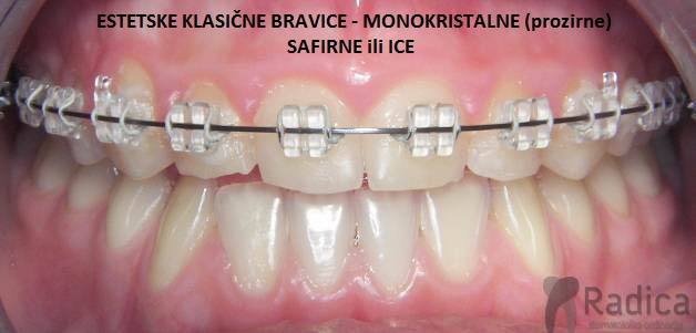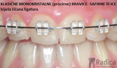 - Keramičke monokristalne – keramičke prozirne bravice poznate kao Safirne ili Ice bravice. Prozirne su poput stakla ili leda. Ove bravice isključivo su klasične i luk se mora vezati dodatnom gumicom ili žicom. Na tržištu ne postoje samoligirajuće safirne ili Ice bravice.