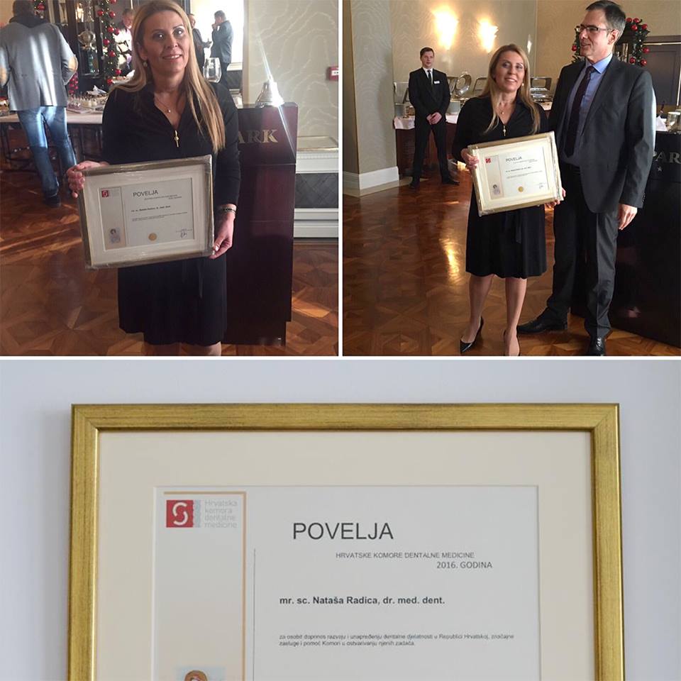 Preponosni smo na spiritus movens naše ordinacije, doktoricu Nataša Radica koja je primila jedno od najvećih strukovnih priznanja – Povelju za osobit doprinos razvoju i unapređenju dentalne djelatnosti u Hrvatskoj!